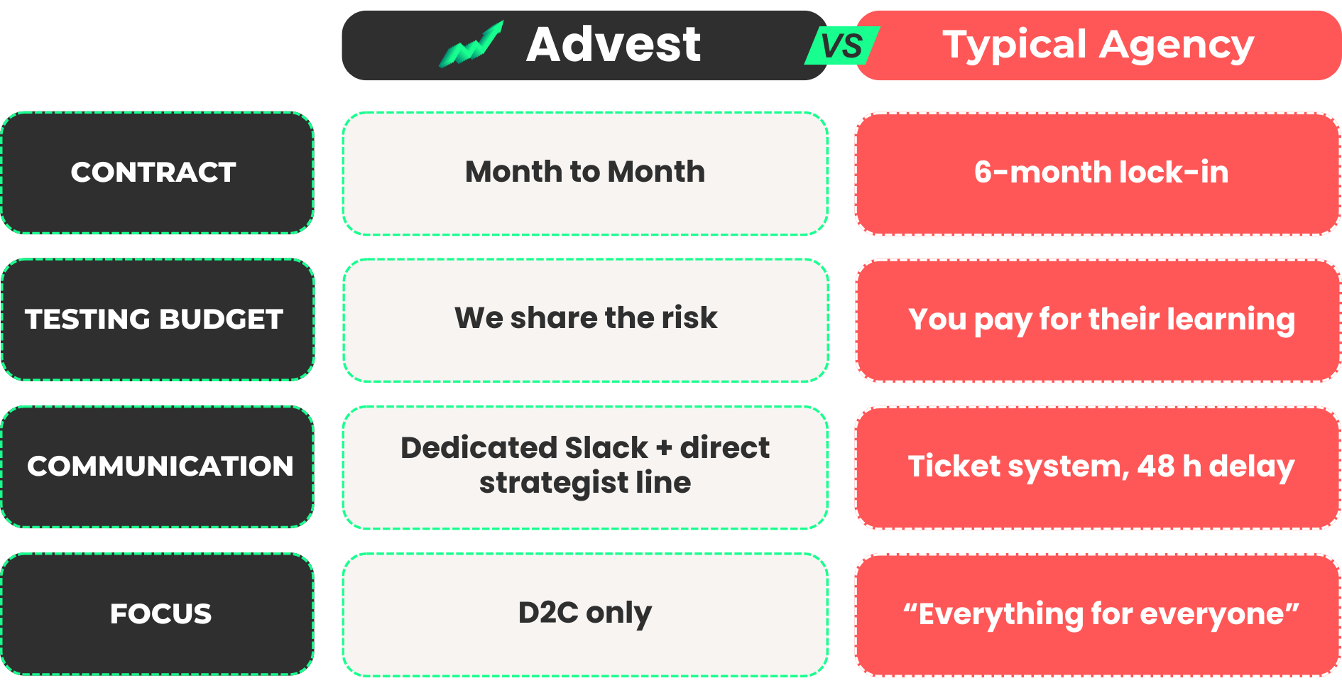 We specialize in working with D2C and ecommerce brands doing between ₹5–10L/month in revenue and looking to scale to ₹25L+ and beyond.